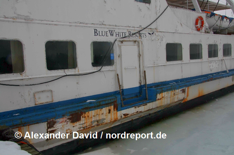 Detailaufnahmen verdeutlichen, daß in letzter Zeit wenig in die Erhaltung des Schiffes investiert wurde. Die Farbe blättert an weiten Bereichen des Schiffes ab. Im Jahr 2009 präsentierte sich die ehemalige "Frisia III" äußerlich noch in deutlich besserer Verfassung. Zu dieser Zeit wurde sie als Hotelschiff bei Sahanlahti eingesetzt, auch eine Bucht des Saimaa Sees, jedoch an ganz anderer Stelle. Seit Spätsommer 2009 gibt es für das Schiff offenbar kein sinnvolles Einsatzgebiet mehr, das sich gewinnbringend vermarkten läßt. Über die weitere Zukunft des Schiffes ist auch vor Ort nichts zu erfahren.
