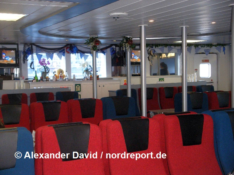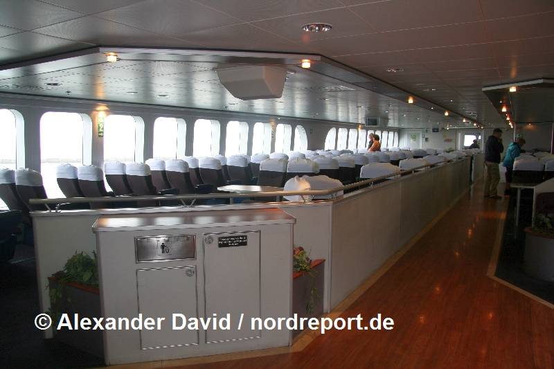 Das Foto oben links zeigt einen Blick in die Standardklasse auf dem oberen Fahrgastdeck, das Foto oben rechts in die Standardklasse auf dem unteren Fahrgastdeck. Wie auf dem "Halunder Jet" wechseln sich Reihenbestuhlung und Vis-à-vis-Bereiche ab.