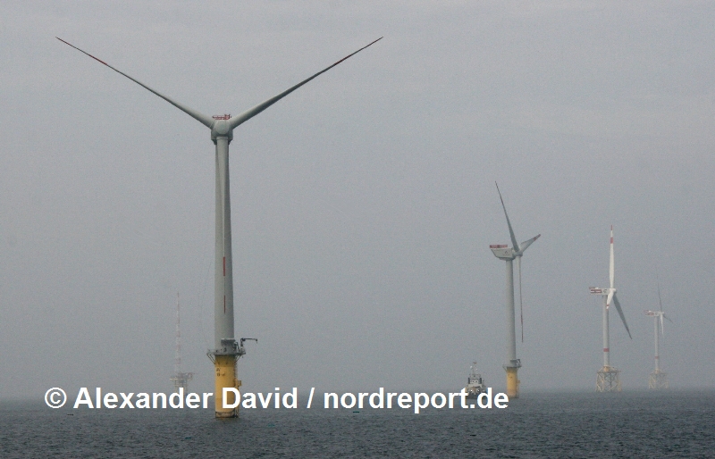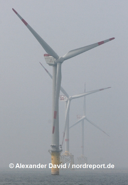 Im Bereich von "Alpha Ventus" ist die Nordsee etwa 30 Meter tief. Niemals zuvor wurden in Deutschland in Wassertiefen dieser Größenordnung Windkrafträder errichtet. Insgesamt wurden zwischen dem 15. 07. und 16.11.2009 zwölf Windräder der 5 MW-Klasse errichtet. Dabei kamen zwei unterschiedliche Typen von Windkraftanlagen zum Einsatz. Sechs Anlagen stammen vom Hersteller Areva, die anderen sechs Anlagen von der Firma Repower. Optisch unterscheiden sich beide Typen nur geringfügig, augenscheinlich größere Unterschiede gibt es jedoch beim Fundament. Um die enormen Ausmaße der Windräder von über 150 Meter Höhe zu verdeutlichen, wird von den Vortragenden wiederholt gerne der Kölner Dom zum Vergleich herangezogen. Sowohl in Nord-Süd- als auch in West-Ost-Ausrichtung beträgt die Entfernung zwischen den Windrädern ca. 800 Meter.
