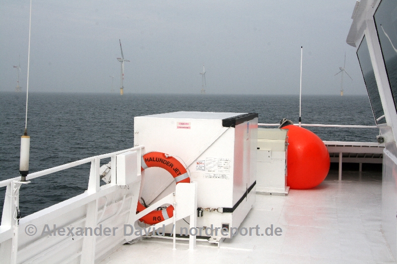 Während der Umrundung des Windparks war das Peildeck des "Halunder Jet" freigegeben (Foto oben). So informativ die Vorträge über den Windpark auch waren - für die meisten Fahrgäste dürfte die Hauptmotivation für die Reise doch gewesen sein, den ersten deutschen Offshore-Windpark einmal live zu sehen. Der "Halunder Jet" verfügt nur über einen kleinen Freideck-Bereich, was für derartige Ausflugsfahrten eher ungünstig ist. Durch die Freigabe des Peildecks war aber genügend Platz vorhanden, um allen Fahrgästen ohne Drängelei einen freien Blick auf den Windpark zu ermöglichen. Letztendlich hat also die Öffnung des Peildecks die Fahrt ungemein aufgewertet.