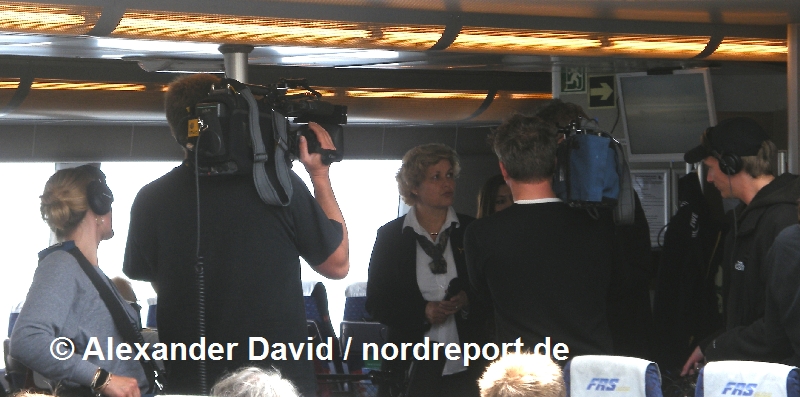 Während der 90-minütigen Hinfahrt erfährt der Fahrgast in einer Vortragsreihe (Foto oben) technische Details und diverse weitere Einzelheiten über den Windpark "Alpha Ventus":
