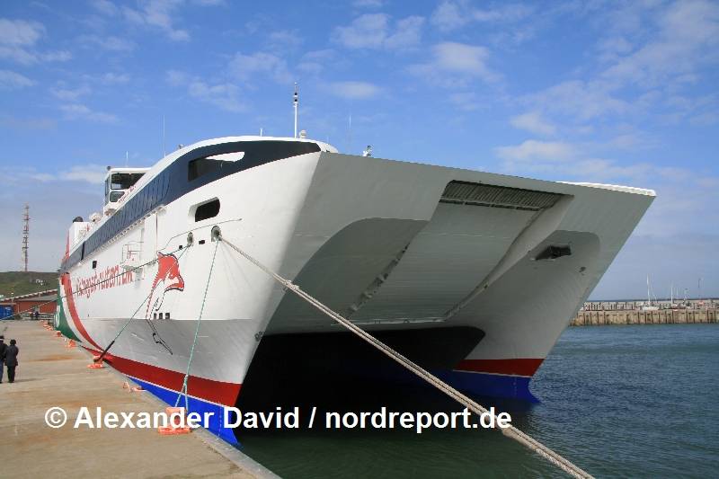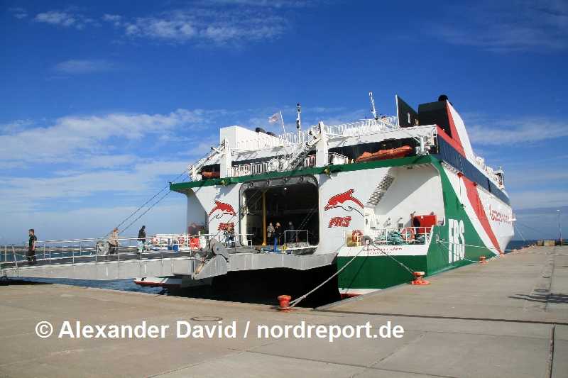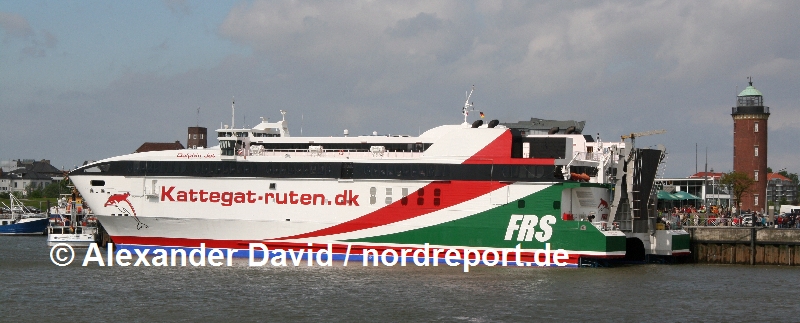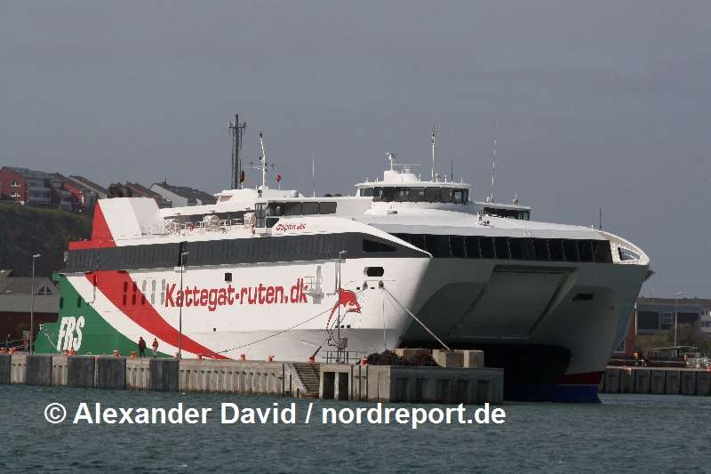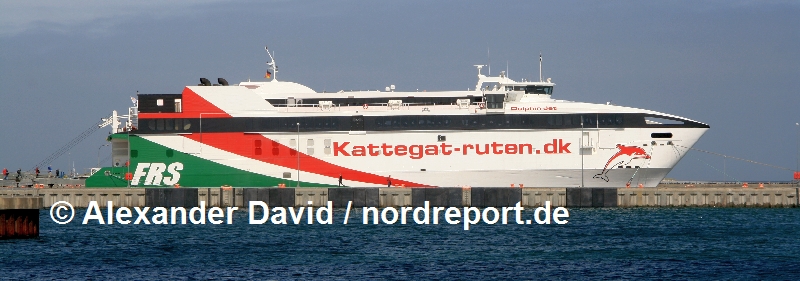 Am 20. September 2011 hatte die FRS Gruppe mit ihrer neu gegründeten Tochtergesellschaft Kattegat-Ruten den Betrieb auf der innerdänischen Strecke zwischen Kalundborg auf Seeland und Aarhus auf Jütland von der Reederei Mols-Linien übernommen. Bisher kommt dort nur eine konventionelle RoPax-Fähre zum Einsatz. Mit der ebenfalls zur FRS Gruppe gehörenden FRS Iberia operiert der Reedereikonzern zudem auch auf mehreren Strecken zwischen Spanien und Marokko in der Straße von Gibraltar. Zwischen Tarifa und Tanger kam bisher der Hochgeschwindigkeits-Katamaran "Tanger Jet II" zum Einsatz. Im April 2012 wechselte der "Tanger Jet II" innerhalb der FRS Gruppe von FRS Iberia zu den Kattegat-Ruten. Da der Name "Tanger Jet II" in dänischen Gewässern unpassend erscheint, wurde nicht nur die Tochtergesellschaft gewechselt, sondern auch gleich der Name. Für die neue Aufgabe trägt das Schiff den Namen "Dolphin Jet". (Der Delphin ist Bestandteil des Firmenlogos mehrerer Tochtergesellschaften der FRS Gruppe, allerdings nicht von Helgoline.) Der "Dolphin Jet" machte sich in der zweiten Aprilhälfte von Algeciras ausgehend auf eine etwa 4.000 km lange Überführungsfahrt von seinem alten Einsatzgebiet in sein zukünftiges. Diese Information dürfte zwar Fährschiffexperten interessieren, jedoch darf die Frage erlaubt sein, was diese Meldung auf einer Seite über den Helgolandverkehr zu suchen hat: