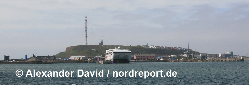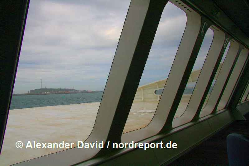 Kurz nach 13:00 Uhr hatte der "Dolphin Jet" den Roten Felsen erreicht. Trotz Windstärke 6 aus West lag das Schiff sehr gut im Wasser. Nur während der letzten Minuten direkt vor der Helgoländer Hafeneinfahrt kam es bei reduzierter Geschwindigkeit zu spürbaren Schiffsbewegungen.