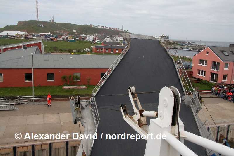 Um 13:10 Uhr (laut Fahrplan 12:45 Uhr) war der Liegeplatz im Helgoländer Südhafen erreicht. Doch wer dachte, daß das Schiff wie in Cuxhaven über eine seitliche Gangway verlassen wird, sah sich getäuscht - nun wurde tatsächlich die Autorampe am Heck des Schiffes ausgefahren. Daß es auf der autofreien Insel Helgoland keine speziellen Terminals zur Abfertigung von Autofähren gibt, wird die wenigsten überraschen, und so mußte beim Anlegen naturgemäß improvisiert und genau gezirkelt werden. Folglich dauerte das Anlegemanöver fast eine Stunde. Gegen 14:00 Uhr betraten dann die ersten Fahrgäste Helgoländer Boden.