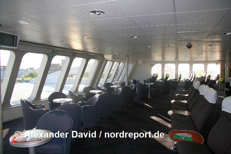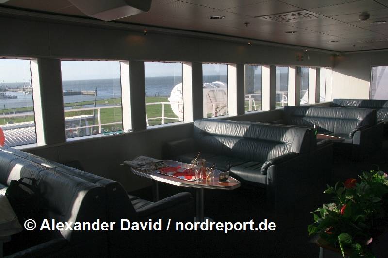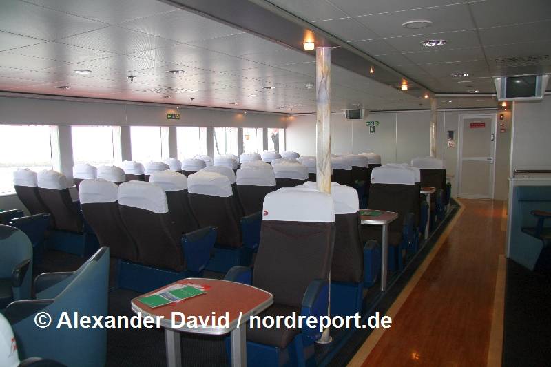 Auf der Steuerbordseite des oberen Fahrgastdecks verfügt der "Dolphin Jet" über einen Business-Bereich (Foto links). Wie bereits weiter oben erwähnt, wurde der Business-Bereich aber nicht für die Gäste der Comfort Class aus dem "Halunder Jet" verwendet, diese erhielten exklusiv Zutritt in den Panorama-Salon im vorderen Bereich des unteren Fahrgastdecks (Foto rechts).