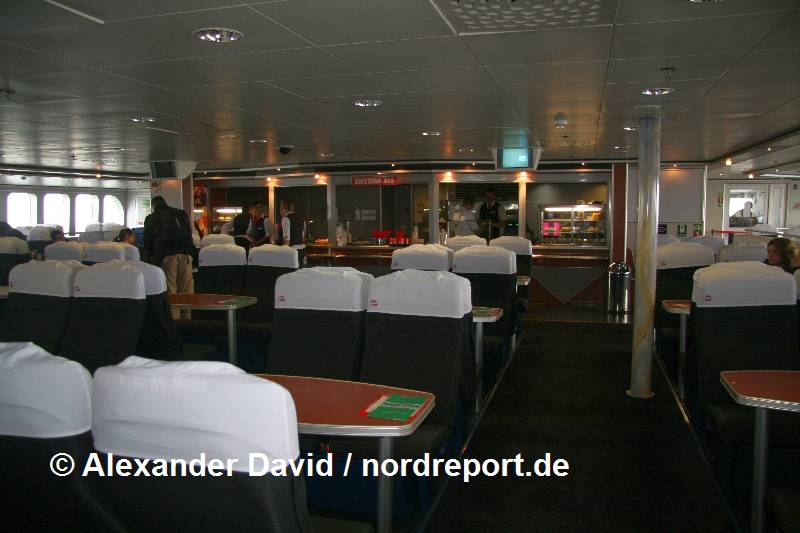 Weiterhin befinden sich drei Bistro-Cafés auf dem Schiff. Die größte dieser Einrichtungen befindet sich im vorderen Bereich auf dem unteren Fahrgastdeck und ist auf dem Foto links im Hintergrund zu erkennen.