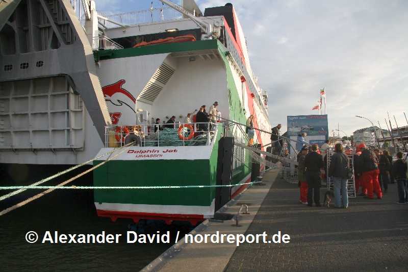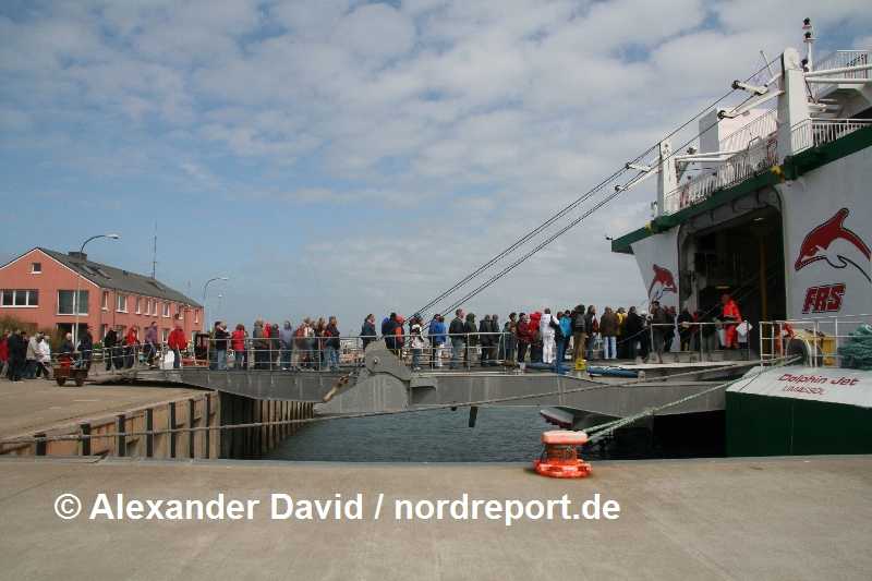 In Cuxhaven (links) erfolgte der Ein- und Ausstieg über eine seitliche Gangway, in Helgoland (rechts) über die hintere Autorampe. Hier fühlte man sich fast in mediterrane Gefilde versetzt, wo die Autofähren mangels spezieller Vorrichtungen ihre Fracht häufig über die Heckklappe direkt auf die Kaimauer entladen und auch die Passagiere ohne Auto das Schiff über das Autodeck betreten und verlassen. Zwischen 14:00 und 16:00 Uhr bestand für Helgoländer und Gäste die Möglichkeit, den "Dolphin Jet" zu besichtigen ("Open Ship"). Somit wurde das Schiff sofort nach dem Aussteigen der Gäste aus Cuxhaven wieder aufs Neue bevölkert. Dieses Angebot stieß offenbar auf reges Interesse: Auf dem Foto rechts ist die auf Einlaß wartende Menschenmenge zu erkennen.