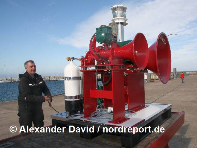 Viel ist nicht geblieben von der "Wappen von Hamburg", dem einstigen Flaggschiff der Helgoland-Flotte. Das von Karsten Hamel aufwendig restaurierte Schiffstyphon ist eine rühmliche Ausnahme. Und da sich die ganze Gerätschaft auch noch in betriebsbereitem Zustand befindet, ist das Typhon nicht nur etwas für die Augen, sondern auch für die Ohren. Inzwischen ist es schon zur Tradition geworden, den alten Wappen-Sound bei besonderen maritimen Anlässen auf der Insel erklingen zu lassen. Gerade in diesen Tagen hatte das Typhon Hochkonjunktur, z.B. zum Saisonauftakt der "Funny Girl" und der "Fair Lady" am 28. April sowie zur Begrüßung der "Atlantis" auf der Helgoländer Reede am 1. Mai. Da durfte es natürlich auch zur Begrüßung des "Dolphin Jet" nicht fehlen. Auch zum Abschied des "Dolphin Jet" durfte man noch einmal in Erinnerungen schwelgen.