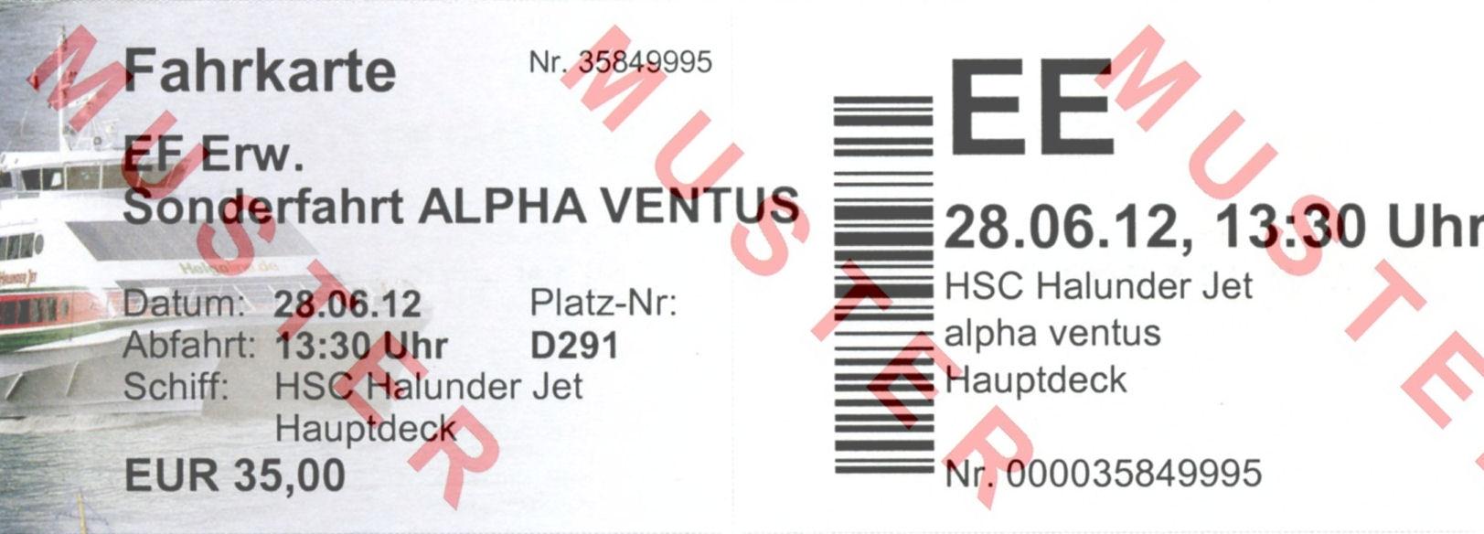 Die Abbildung links zeigt ein Ticket für die erste Fahrt nach "Alpha Ventus". Kombi-Tickets von Hamburg oder Cuxhaven gab es nicht. Für die Strecke nach Helgoland war ein reguläres Tagesticket zu lösen und unter der selben Buchungsnummer dann zusätzlich das Sonderticket nach "Alpha Ventus" für 35,- EUR. Nach "Alpha Ventus" wurden nur Tickets in der Jet Class angeboten, die Comfort Class war den Referenten der Energieunternehmen sowie Vertretern von Presse, Radio und Fernsehen vorbehalten. Der auf der Abbildung erkennbare Sitzplatz D291 befindet sich im vorderen Salon des unteren Fahrgastdecks. Das untere Deck war jedoch während der Fahrt nach "Alpha Ventus" gesperrt. Aus logistischen Gründen erhielten alle Fahrgäste Sitzplätze im hinteren Salon des oberen Fahrgastdecks, denn hier wurden Informationsveranstaltungen über den Windpark angeboten. Über den Sitzplatzwechsel wurde schon vor der Fahrt informiert, die bereits zuvor ausgehändigten Fahrkarten behielten aber trotz der abweichenden Sitzplatznummer ihre Gültigkeit. Rechnet man die Vertreter der Medien, Angestellte der Energiekonzerne und zahlende Fahrgäste zusammen, befinden sich geschätzt etwa 80 Personen an Bord. "Alpha Ventus"-Tickets gibt es nicht über die Online-Buchung, sondern nur über die Hotline oder die Ticketschalter.