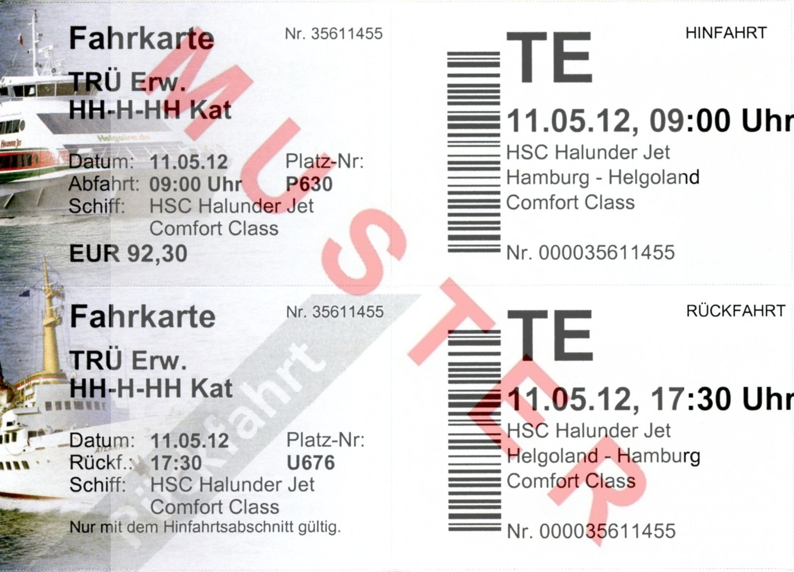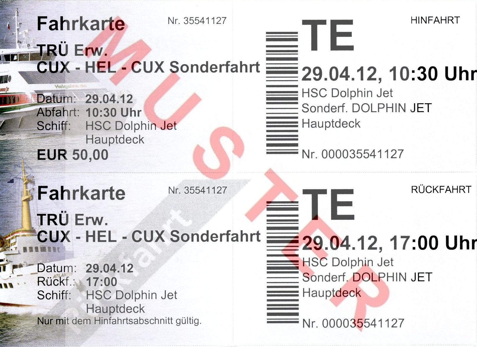 Die Abbildung links zeigt das Ticket für die Sonderfahrt mit HSC Dolphin Jet zum Roten Felsen noch mit dem ursprünglich geplanten Datum 29.04.2012 und der ursprünglichen Abfahrtszeit um 10:30 Uhr in Cuxhaven bzw. um 17:00 Uhr auf Helgoland. Anders als beim "Halunder Jet" erfolgt keine feste Sitzplatzzuordnung. Rechts ist das Kombiticket Hamburg-Cuxhaven mit HSC Halunder Jet mit Umstieg auf den im Abschnitt Cuxhaven-Helgoland verkehrenden "Dolphin Jet" für den neuen Termin am 11.05.2012 dargestellt. Der Name "Dolphin Jet" oder ein Hinweis auf den Schiffswechsel taucht auf dem Ticket überhaupt nicht auf, d.h. dem Fahrschein ist der besondere Einsatz des "Dolphin Jet" nicht zu entnehmen. Nur die abweichende Abfahrzeit um 17:30 Uhr auf der Rücktour deutet vorsichtig auf eine Besonderheit hin.