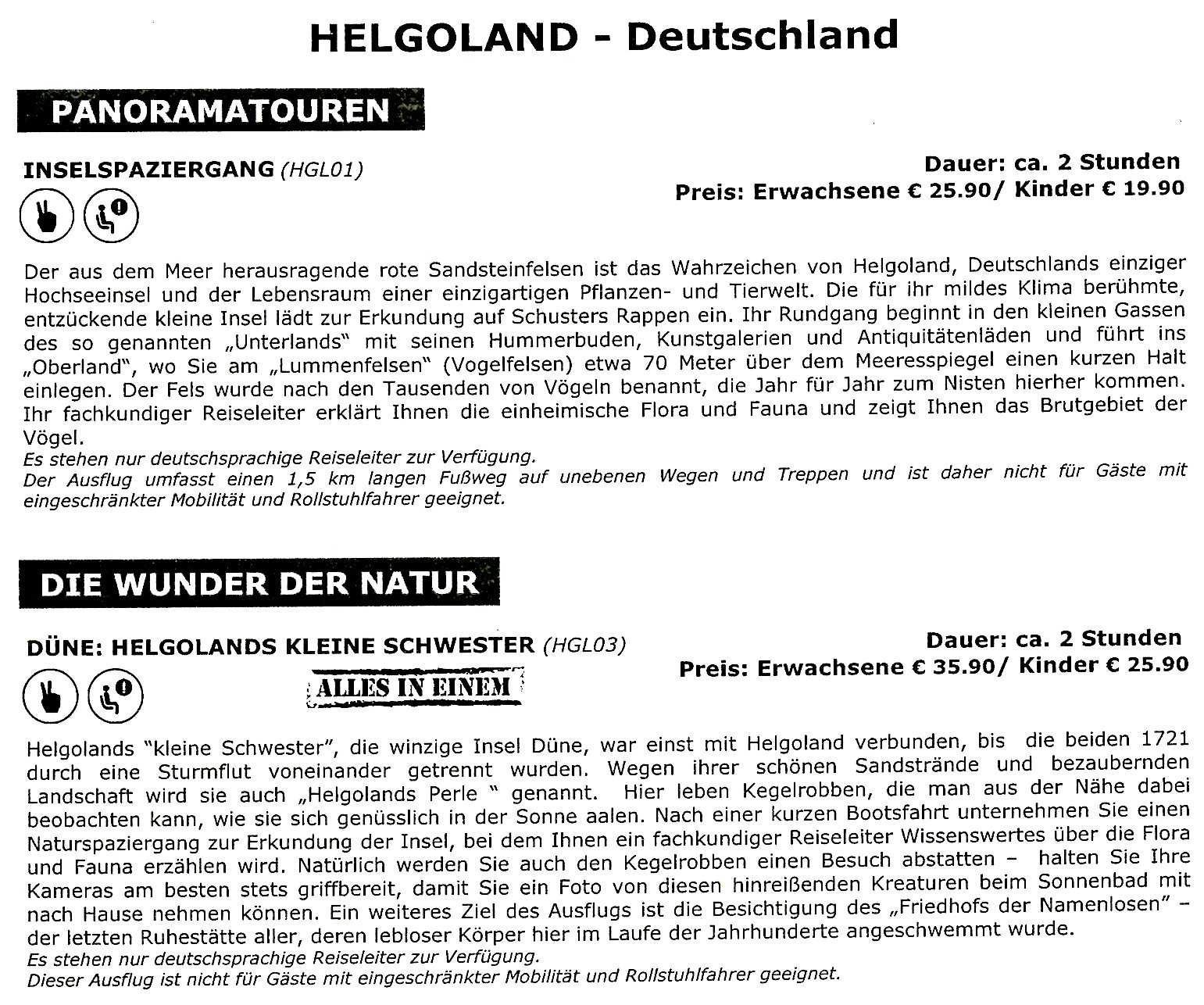 Wäre es zum Austendern gekommen, hätten theoretisch zwei geführte Landgänge auf dem Programm gestanden (siehe Abbildung oben): Der Inselspaziergang (HGL01) und die Dünenwanderung (HGL03). Die noch im Jahr 2012 mit "MSC Lirica" und im Jahr 2013 mit "MSC Magnifica" angebotene Bunkerführung (HGL02) war nicht mehr im Angebot.