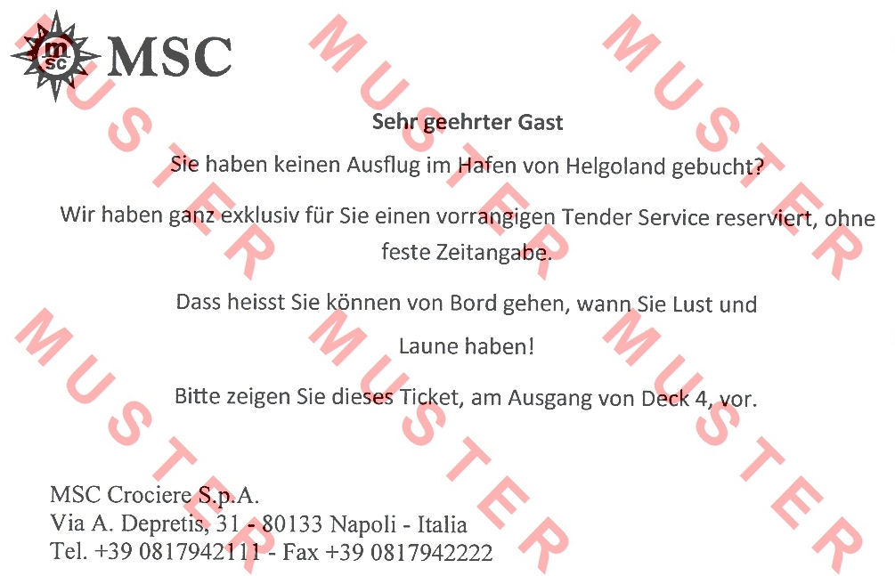 Aus dem oben abgebildeten Bordprogramm ist ersichtlich, daß für Gäste ohne gebuchten Landausflug ein kostenloses Tenderboot-Ticket auf dem Schiff zu organisieren ist. Hierbei gilt das First Come - First Serve - Prinzip. Davon ausgenommen sind allerdings einige Kabinen- und Suiten-Kategorien, bei denen besondere Dienstleitungen inkludiert sind, so z.B. auch ein vorrangiger Tender-Service zur Insel Helgoland (Abbildung rechts). Sofern wie am 10. Mai nicht ausgetendert wird, hält sich dieses Privileg natürlich in überschaubaren Grenzen.