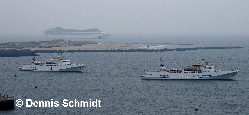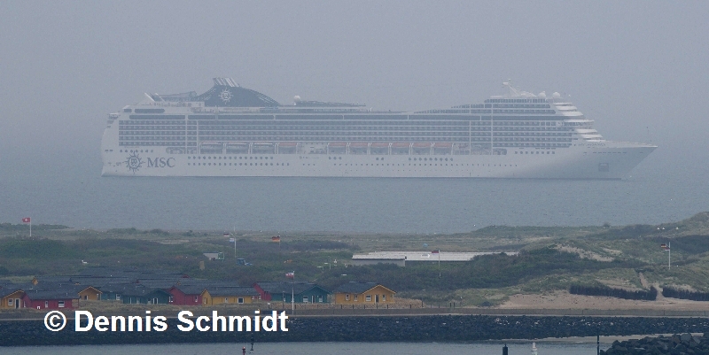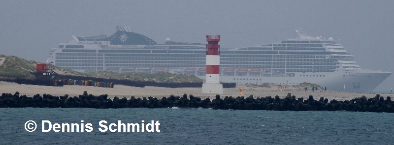 Die "MSC Magnifica" auf ihrem Liegeplatz östlich der Düne aus zwei unterschiedlichen Perspektiven. Diese und weitere entsprechend gekennzeichnete Bilder wurden mir von Dennis Schmidt zur Verfügung gestellt.
