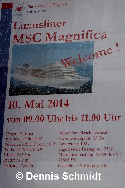 Nach zwei gescheiterten Versuchen in den vergangenen Jahren, mit MSC im Rahmen einer Mini Cruise auf die Insel Helgoland ausgebootet zu werden (nordreport.de berichtete), erfolgte am 10. Mai 2014 mit "MSC Magnifica" ein weiterer Anlauf. Doch auch dieses Mal wurde, wie auf den beiden Reisen zuvor, aufgrund des Seegangs das Austendern auf die Insel für zu gefährlich angesehen und folglich abgesagt. Anders als bei den beiden Reisen zuvor, bei denen der Inselaufenthalt recht frühzeitig am Morgen gegen 8:00 Uhr über Lautsprecher abgesagt wurde, führte man bei dieser Reise zunächst offenbar Untersuchungen an zwei verschiedenen Stellen vor der Insel hinsichtlich der Möglichkeit des Ausbootens durch. Gegen 9:45 Uhr wurde dann aber auch bei dieser Reise der Landgang aufgrund zu erwartender Wellenhöhen von 2,5 Meter für nicht durchführbar erklärt.
