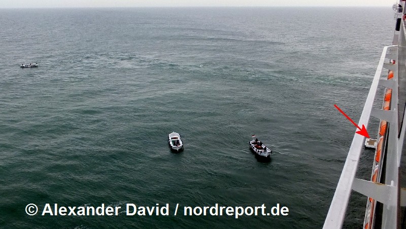 Rein optisch machte der Liegeplatz östlich der Düne seegangstechnisch einen deutlich ruhigeren Eindruck als jener südlich der Insel. Auch um den neuen Liegeplatz versammelten sich nun mehrere Börteboote. Als sich wenig später auf der vom Wind abgewandten Steuerbordseite eine Luke im hinteren Teil des Schiffsrumpfs öffnete (roter Pfeil), schien das Ausbooten konkretere Formen anzunehmen.
