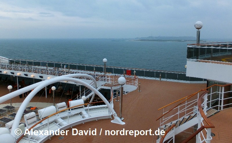 Anders als die "MSC Lirica", die auf der Mini Cruise nach Helgoland vor zwei Jahren mehrfach um den Roten Felsen herumkurvte, ankerte die "MSC Magnifica" den gesamten Tag über östlich der Düne und veränderte die Lage nicht. Das am Nachmittag entstandene Foto zeigt ein Bild über die oberen Freidecks mit der Insel und der Düne im Hintergrund. Inzwischen hatte sich das Wetter verschlechtert. Neben einsetzendem Regen stieg auch die Wellenhöhe auf ca. 1,8 Meter an. Zwar wurde die am Vormittag über Lautsprecher prognostizierte Wellenhöhe von 2,5 Meter nicht erreicht, die sich über den Tag verschlechternde Wetterlage mit Regen und zunehmendem Wind war aber sicherlich ein Grund für die Absage des Ausschiffens, schließlich hätte man am Nachmittag ja den Großteil der 2.683 Passagiere an Bord, die sich für einen Landgang entschieden hätten, auch wieder sicher zurück aufs Schiff bringen müssen. Zudem hätte die Fahrt zwischen Schiff und Insel mit den Tender- bzw. Börtebooten um die Düne herum, gemessen am Ausbooten der Seebäderschiffe auf der Helgoländer Reede, sehr lange gedauert. Für den einen oder anderen Helgoland-Freak wäre so eine Fahrt um die Düne herum sicher ein Erlebnis gewesen, andere Fahrgäste hätten so eine Fahrt aber womöglich als unkomfortabel empfunden.