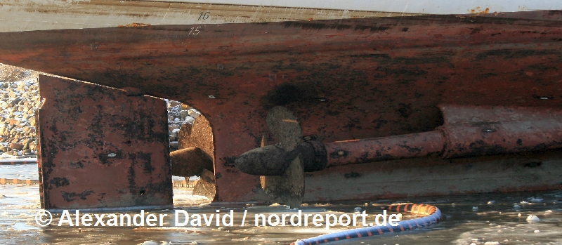 Dieses Archivfoto vom 19. Dezember 2010 zeigt die Steuerbordschraube im Vordergrund noch am Schiff kurz vor der Demontage in Esbjerg / Dänemark. Die Backbordschraube im Hintergrund wurde bei der Zerlegung des Schiffes beschädigt und blieb nicht erhalten.