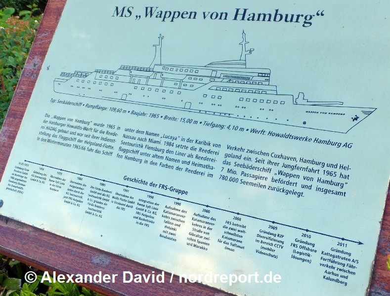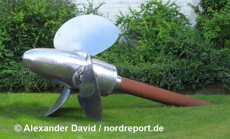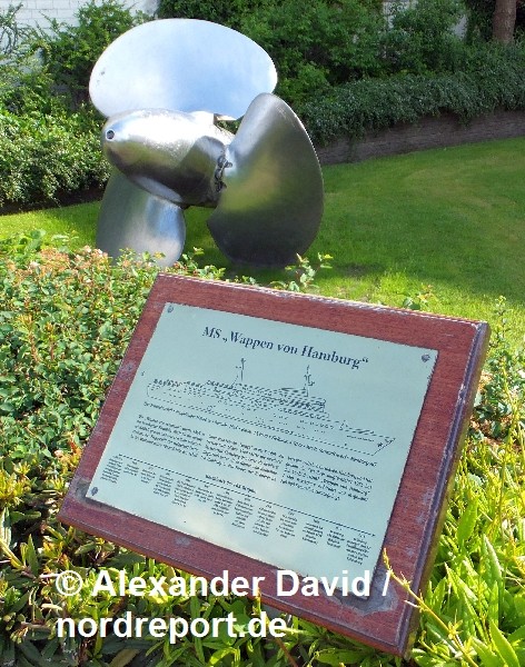 Im Zuge der Demontage des ehemaligen Helgoland-Flaggschiffs "Wappen von Hamburg" im Jahr 2010 kamen viele kleine Teile des Inventars als Liebhaberstücke unter den Hammer. Aber auch einige größere Teile blieben erhalten. Die bekanntesten dürften die komplette Kommandobrücke der "Wappen" sein, die im Schiffahrtsmuseum Bremerhaven besichtigt werden kann, und das Typhon, das sich in betriebsbereitem Zustand in Privatbesitz auf Helgoland befindet (nordreport.de berichtete). Mit der ehemaligen Steuerbordschraube hatte sich die FRS-Gruppe ein weiteres Exponat dieses Schiffes gesichert. Das Erinnerungsstück befindet sich auf einer Rasenfläche vor dem Reedereigebäude am Norderhofenden in Flensburg (Foto rechts). Über eine Tafel neben der Schraube erhält der Betrachter in kompakter Form Informationen über die Historie des Schiffes. Die zur FRS-Gruppe gehörende Reederei Seetouristik Flensburg (heute FRS Helgoline) hatte die "Wappen von Hamburg" zwischen 1984 und 2006 zwischen Cuxhaven, Hamburg und Helgoland eingesetzt.