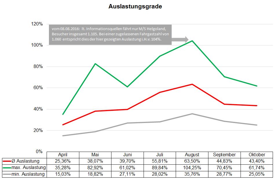 Die Abbildung links zeigt die durchschnittliche Besucherzahl pro Tag für die Monate April bis Oktober 2016 im Schnitt, d.h. im April kamen durchschnittlich 678 Gäste pro Tag auf die Insel, im Mai 1.323 Besucher, im Juni 1.478 Besucher usw. Mit 3.344 Gästen wurde der absolute Saison-Höchstwert in diesem Jahr am 26. Juli erzielt.