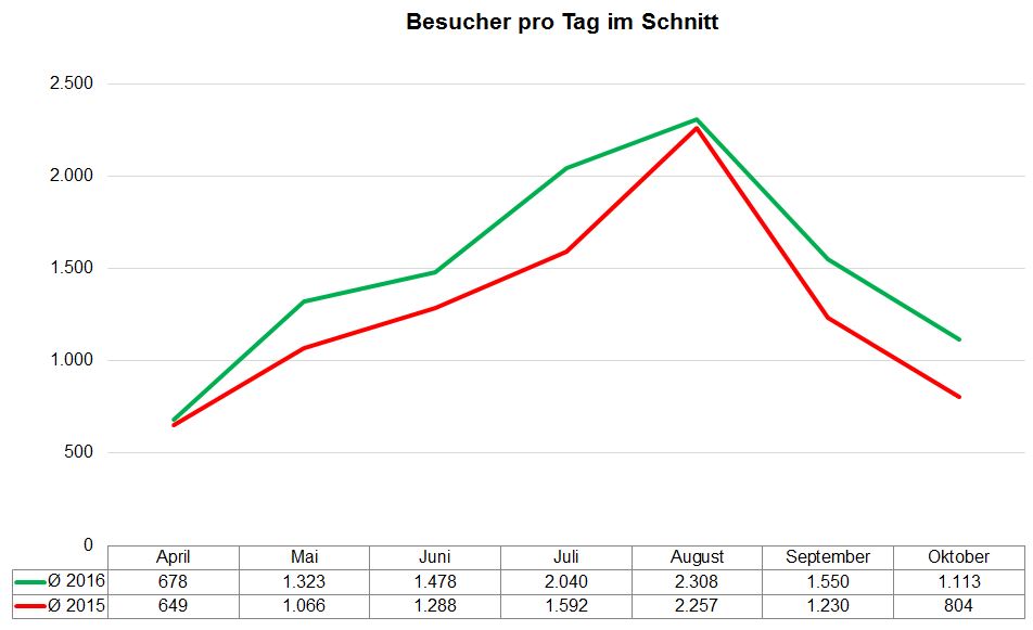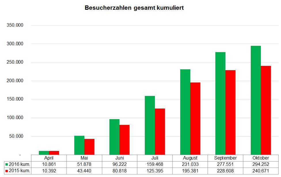 Von April an wird der Besucherzuwachs von Monat zu Monat größer, sodaß im Oktober am Ende des betrachteten Zeitraums 294.252 Besucher zu Buche stehen. Im Vorjahr konnten im gleichen Zeitraum lediglich 240.671 Gäste gezählt werden. Für 2016 bedeutet dies eine Steigerung von 53.581 Besuchern. Dies ist ein sattes Plus von 22,3%.