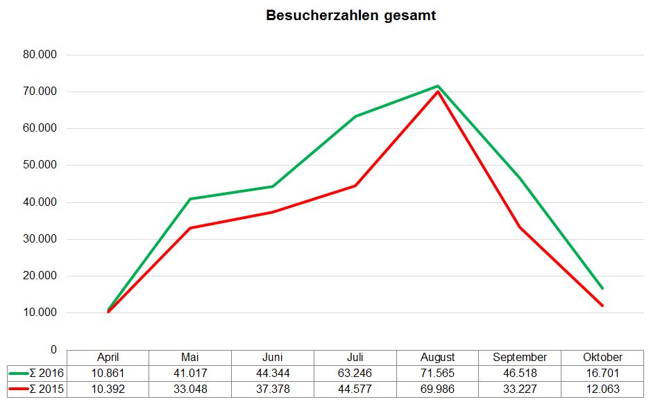Die nebenstehende Graphik zeigt die Gesamtbesucherzahl kumuliert für den Zeitraum 15. April bis 15. Oktober 2016.