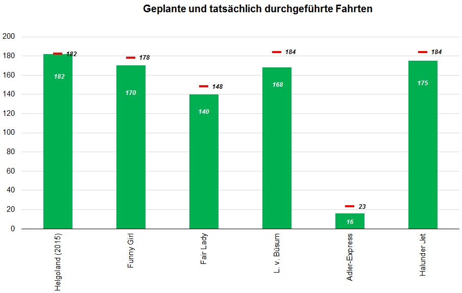 Die nebenstehende Graphik zeigt die geplanten und tatsächlich durchgeführten Fahrten pro Helgoland-Schiff an. Insgesamt sollten 899 Fahrten erfolgen, 851 konnten dann schließlich absolviert werden. Die neue "Helgoland" konnte alle Fahrten planmäßig durchführen. (Im April kam die "Helgoland" für zwei Fahrten aufgrund eines langfristig geplanten Garantie- Werftaufenthalts nicht zum Einsatz. Diese Tage wurden nicht als Ausfall gewertet. Alternativ wurde die "Fair Lady" eingesetzt.) Der "Adler-Express" lief die Insel nur Montags an und kommt so auf eine vergleichsweise geringe Anzahl an Fahrten, von denen zudem auch einige wetterbedingt abgesagt werden mußten.