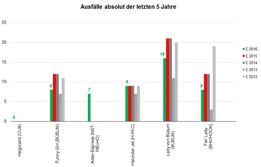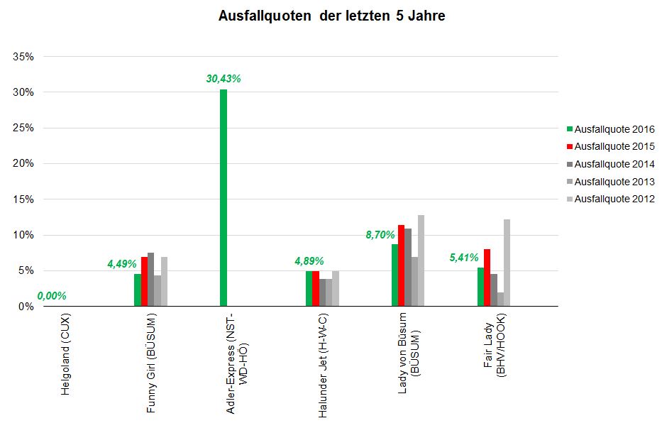 Die nebenstehende Graphik zeigt die absoluten Ausfallquoten aller Helgolandschiffe im Vergleich für die letzten fünf Jahre (Ausnahmen nur 2016: "Adler-Express", da vorher nur Sonderfahrten und "Helgoland" wegen Neubaus). Im Vergleich kam die "Atlantis" in den letzten fünf Jahren auf drei bis elf Ausfalltage pro Saison. Die Anzahl der Absagen für die "Funny Girl", die "Lady von Büsum" und die "Fair Lady" liegen unter dem Vorjahreswert, der "Halunder Jet" erreicht exakt den Wert aus 2015, 2014 und 2012. Bei der "Fair Lady" sind die drei Ausfalltage inkludiert, die sich aus der Überführung der "Atlantis" nach Rotterdam ergeben haben.