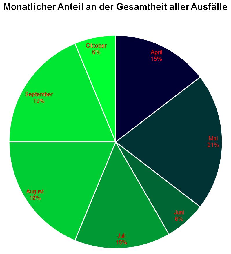 Die wenigsten Ausfälle fielen mit jeweils 6% auf die Monate Juni und Oktober. Die anderen Monate teilten sich den Rest zwischen 15% und 21% relativ gleichmäßig auf.