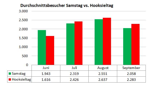 Aufgrund statistischer Auffälligkeiten im Hooksiel-Verkehr wird erstmals nebenstehendes Datenmaterial auswertet. Die Illustration zeigt die Durchschnittsbesucher für die Samstage getrennt nach den Monaten Juni, Juli, August und September 2016 im Vergleich mit den Durchschnittsbesuchern für die Hooksieltage in den selben Monaten. Für Juli, August und September liegen die Tage mit Hooksiel-Besuchern durchschnittlich sogar über den hohen Samstags-Werten. Der Vergleich macht deutlich, daß die Hooksiel-Fahrten gut gebucht gewesen sein müssen und sich die Ausweitung der Hooksiel-Termine für die Reederei und Helgoland ausgezahlt hat.
