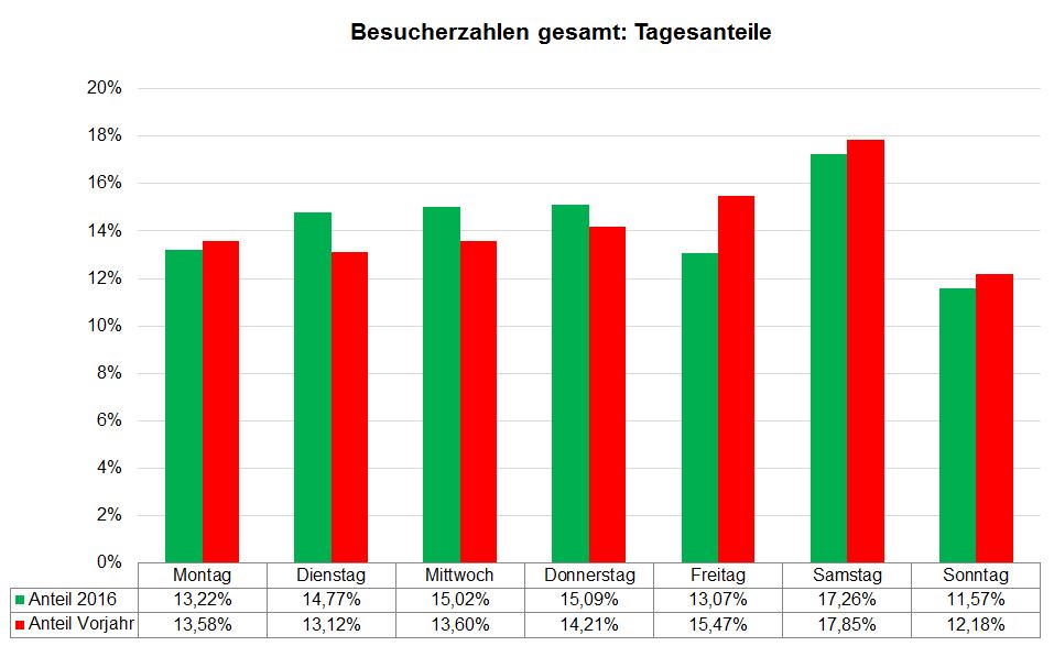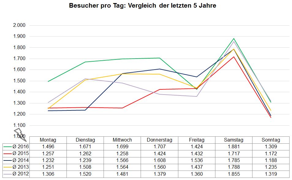 Die Abbildung rechts zeigt die Auswertung der Besucherzahlen nach Wochentagen. Mit durchschnittlich 1.881 Besuchern ist der Samstag im Jahr 2016 nicht nur unverändert der besucherstärkste Tag, sondern auch der stärkste Wert der vergangenen fünf Jahre knapp vor dem Wert aus dem Jahr 2012 (1.855). Die Wochentage Montag bis Donnerstag liegen 2016 gravierend über den Vorjahreswerten. Beim Mittwoch beträgt der Zuwachs fast 450 Gäste. Das sehr gute Jahresergebnis über die komplette Saison leitet sich also davon ab, daß der Samstag unverändert stark blieb, die Besucher aber 2016 auch deutlich häufiger an den Wochentagen Montag bis Donnerstag auf die Insel kamen.