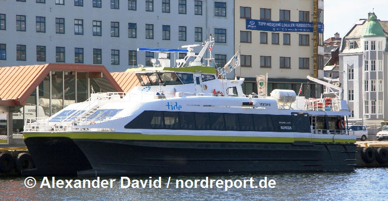 "Seewind II" noch als "Tidebris" im Juli 2011 im norwegischen Bergen (unten). Das Schiff fuhr seinerzeit noch für die nicht mehr existierende Reederei Flaggruten zwischen Bergen und Stavanger. Gebaut wurde es im Jahr 2002 unter dem Namen "Vindafjord". Der Bug wurde für den Windpark-Einsatz angepaßt.