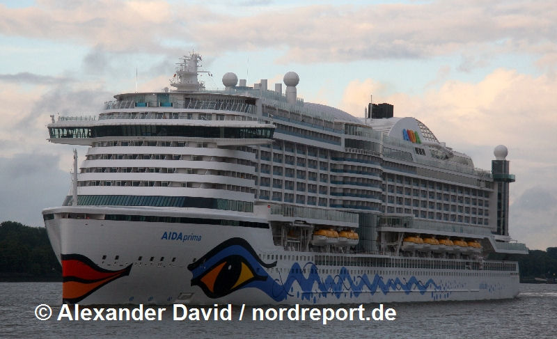 Der "Halunder Jet" passiert die aus Hamburg auslaufende "AIDAprima" bei Wedel.