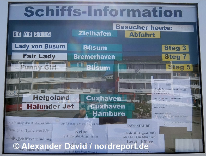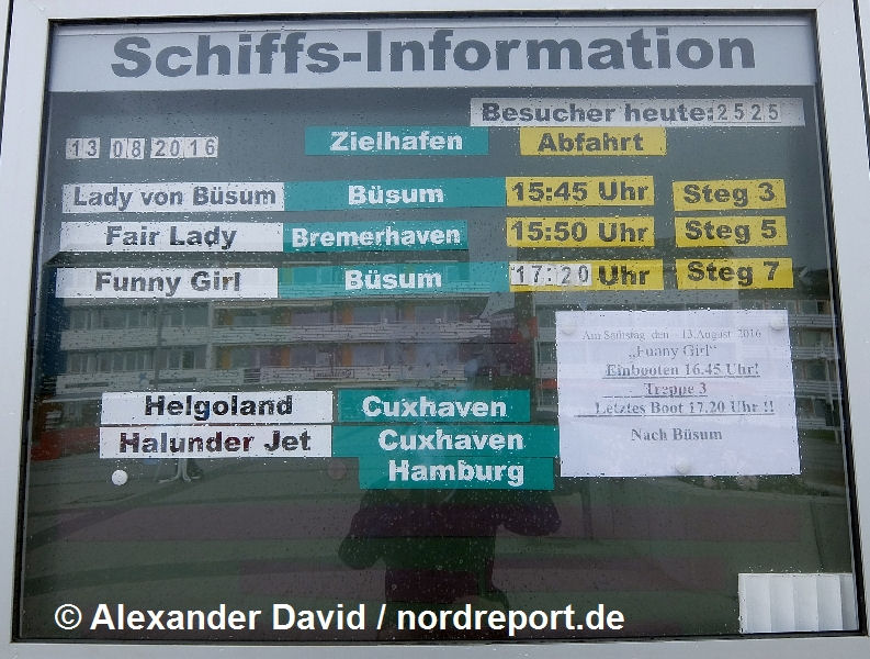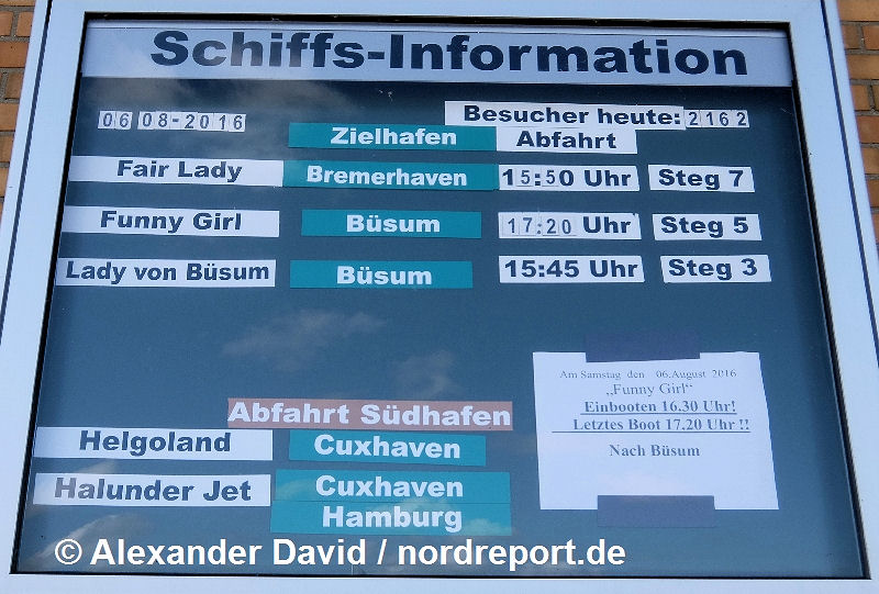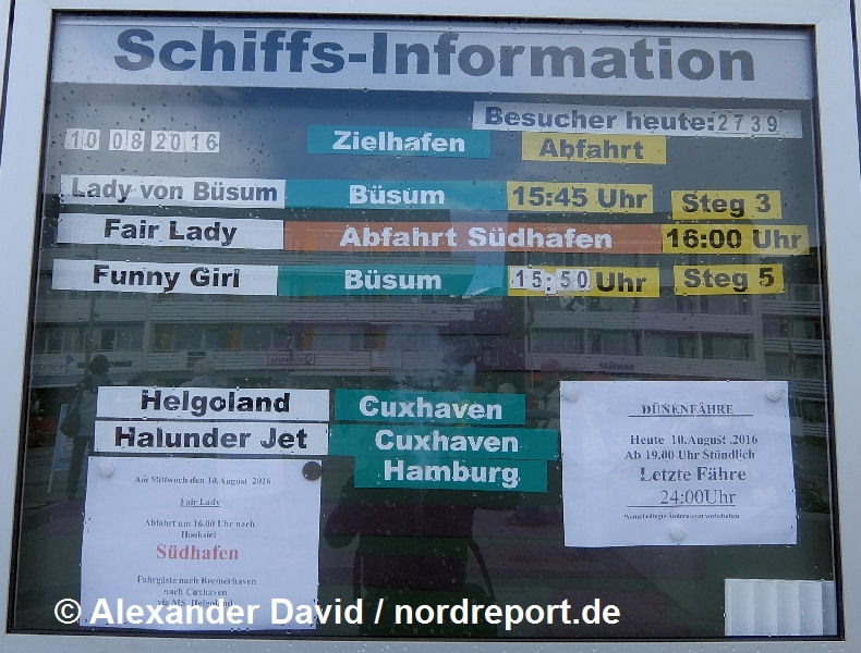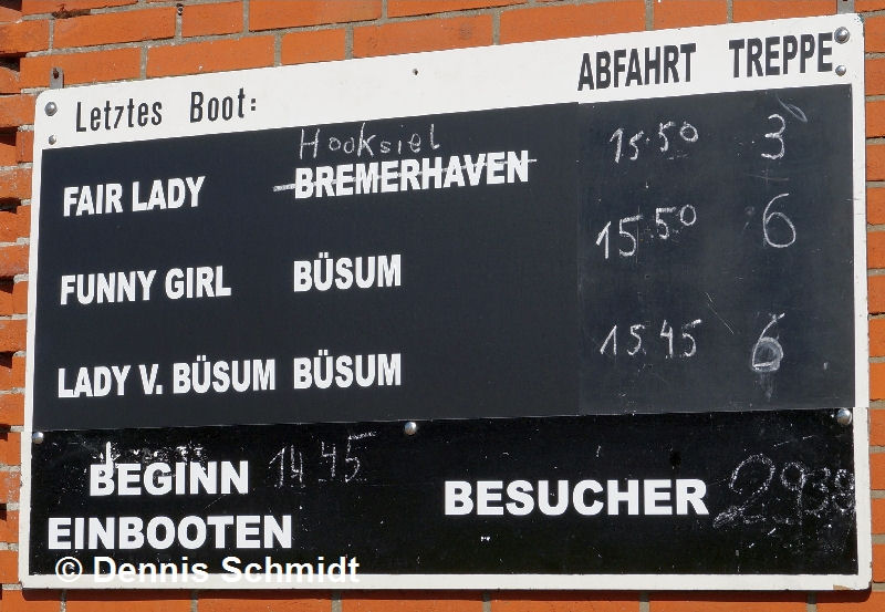 Bei der Auflistung der Flotte weiter oben wurde bereits angesprochen, daß die Hooksiel-Fahrten deutlich ausgeweitet wurden. Das obige Bild zeigt die Abfahrtstafel für den 10. August 2016, dem 126. Jahrestag der Zugehörigkeit zu Deutschland. Wie schon zum 125. Jahrestag im Vorjahr wurde die "Fair Lady" an diesem Tag von Hooksiel aus eingesetzt.
