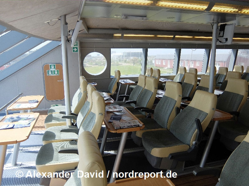 Im "Halunder Jet" wurden nach 13 Jahren Einsatzzeit die Sitzbezüge im Oberdeck grundlegend erneuert. Das Foto zeigt die neuen Farben in der Comfort Class. Die Sitze auf dem Hauptdeck werden in der nächsten Winterpause erneuert.