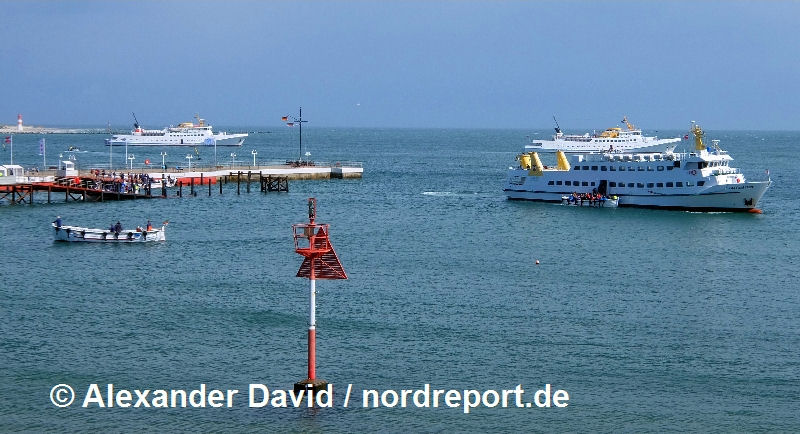 Noch kann man sich aber auf der Reede ausbooten lassen. Wie im letzten Jahr sind acht Boote im Anlandungsdienst zu sehen: "Claudia", "Pirat", "No.1", "No.6", "Rasmus", "Sellebrunn", "Atlantis" und "Hamborger Lock". Da aber täglich nur noch maximal drei Seebäderschiffe abgefertigt werden müssen, sind meistens nicht alle acht Boote gleichzeitig im Einsatz. Die Boote wechseln sich tageweise ab, sodaß in der Regel sechs Boote gemeinsam gesichtet werden können. Im Binnenhafen findet man zudem das Börteboot "Uranus", das aber, wie schon 2015, nicht mehr am Anlandungsbetrieb teilnimmt.