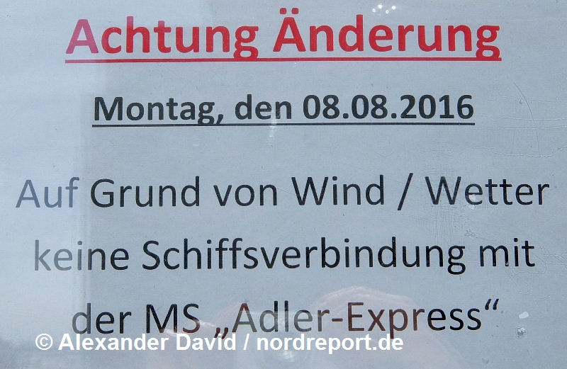 In den letzten beiden Jahren führte der "Adler-Express" einige Sonderfahrten am Saisoneinfang und -ende von mehreren nordfriesischen Häfen nach Helgoland durch. Aufgrund der großen Nachfrage fährt des Einrumpfschnellschiff in dieser Saison immer Montags von Nordstrand, Wittdün/Amrum und Hörnum/Sylt zu Deutschlands Hochseeinsel. Einziger Wermutstropfen ist die begrenzte Seetauglichkeit des Schiffes in der offen See, das jenseits von etwa vier Windstärken Helgoland nicht mehr anläuft (Foto unten) und dann in der Regel mit einem Ersatzfahrplan zwischen Nordstand und Sylt verkehrt. Mehrere Versuche wurden unternommen, den "Adler-Express" in dieser Saison auf Helgoland im Binnenhafen abzulichten. Aus wettertechnischen Gründen ist es bei den Versuchen geblieben. Die Fotografen waren vor Ort, aber das Schiff nicht. Daher muß ein Foto dieses Schiffes in Nordstand als Ersatz dienen (oben).