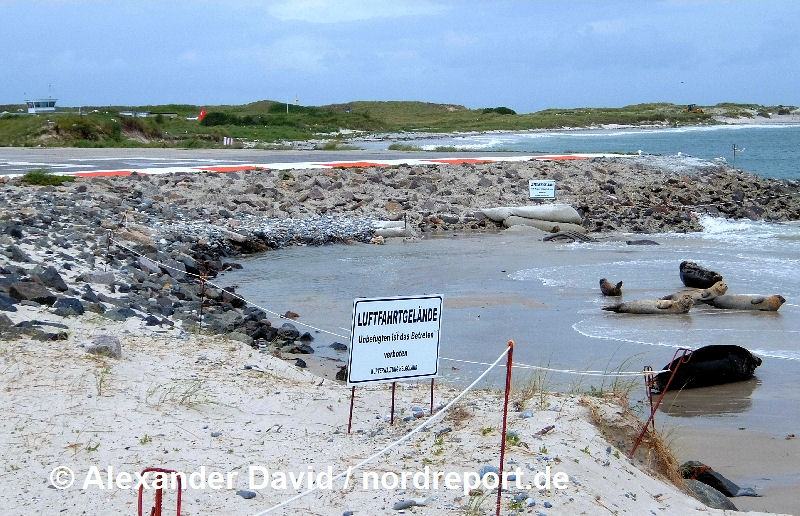 Bereits im letzten Jahr waren auf der Düne gravierende Landverluste am Südstrand zwischen Landebahn und Aade zu verzeichnen, sodaß bei Hochwasser eine Umrundung der Düne seitdem nicht mehr möglich war. In diesem Jahr sind daher in diesem Bereich und auf der gesamten Ostseite der Düne umfangreiche Maßnahmen zum Küstenschutz angelaufen. Mit den Schutzmaßnahmen wurde zunächst auf der Ostseite begonnen. Diese haben im Sommer 2016 den Bereich südlich der Nord-Süd-Landebahn noch nicht erreicht, sodaß hier die Wellen immer noch die Landebahn streifen (Foto oben). Den Tieren scheint es in der Einflugschneise gut zu gefallen.