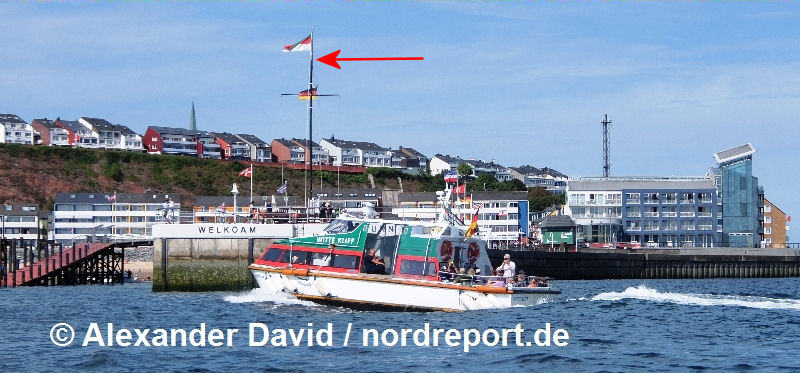 Das obige Foto wurde ein paar Tage nach der diesjährigen Börteboot-Regatta aufgenommen. Auf der Spitze der Landungsbrücke ist der hölzerne Flaggenmast mit der Deutschen und der Helgoländer Flagge zu sehen, der am oberen Ende durch eine Metallkonstruktion erweitert wurde und somit wieder seine ursprüngliche Länge erhielt (Übergang = roter Pfeil). Das ursprünglich obere Ende des Mastes war vor Jahren durch einen Blitzeinschlag zertrümmert wurden und mußte abgesägt werden. Zum Zeitpunkt der Regatta zeigte sich der Mast noch ohne die Erweiterung, wie das Bild vom Start des zweiten Rennens zwei Fotos weiter oben verdeutlicht.