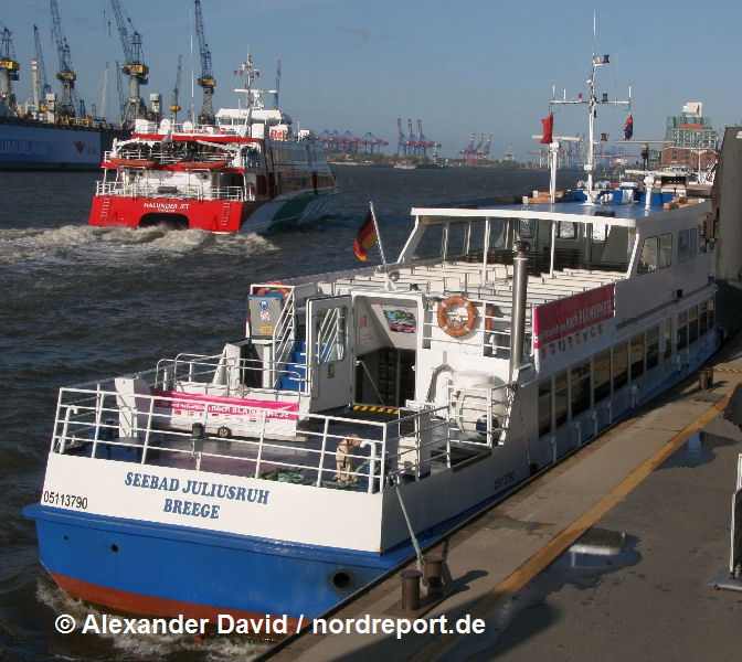 Im Vordergrund ist übrigens das Fahrgastschiff "Seebad Juliusruh" zu sehen. Mit diesem Schiff hat HanseFerry, ein FRS-Tochterunternehmen, an diesem Tag den planmäßigen Fährbetrieb auf der Elbe zwischen den St. Pauli Landungsbrücken und Blankenese eröffnet. Das Schiff zeigt sich vor der ersten öffentlichen Fahrt noch mit dem Namen "Seebad Juliusruh", wird aber, nachdem alle bürokratischen Angelegenheiten erledigt sind, demnächst umbenannt in "Kleine Freiheit", was natürlich wesentlich besser zu Hamburg paßt. Zuletzt war das Schiff in der Ostsee rund um Rügen im Einsatz, daher der Name. Auf dem Ticket trägt das Schiff schon den neuen Namen.