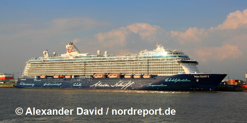 Kurz darauf passiert die "Fair Lady" die zum Ablegen bereitliegende "Mein Schiff 4" (TUI) an der Columbuskaje.